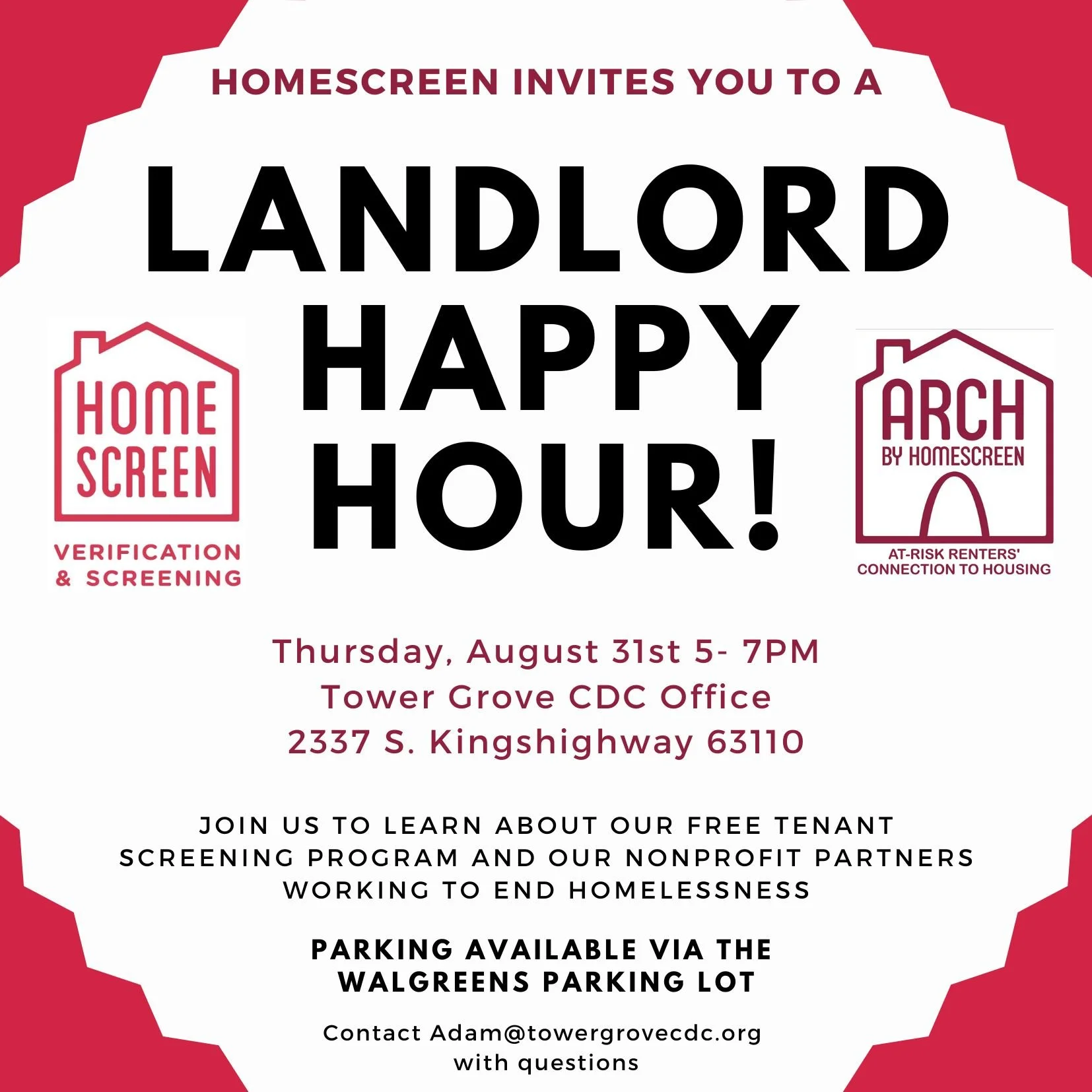 Landlord Happy Hour Thursday, August 31, 2023 5:00 PM 7:00 PM Google Calendar ICS Homescreen invites you to a Landlord Happy Hour where you can learn about their free tenant screening program and their nonprofit partners working to end homelessness.