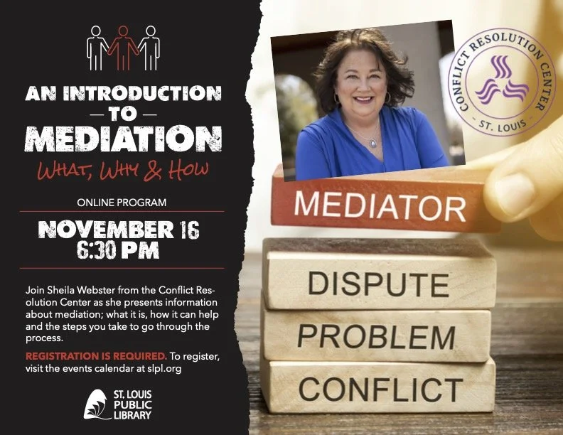 Conflict Resolution Center-St. Louis enjoyed sharing our mission and offered services to City residents through this online program with our partner, St. Louis Public Library.