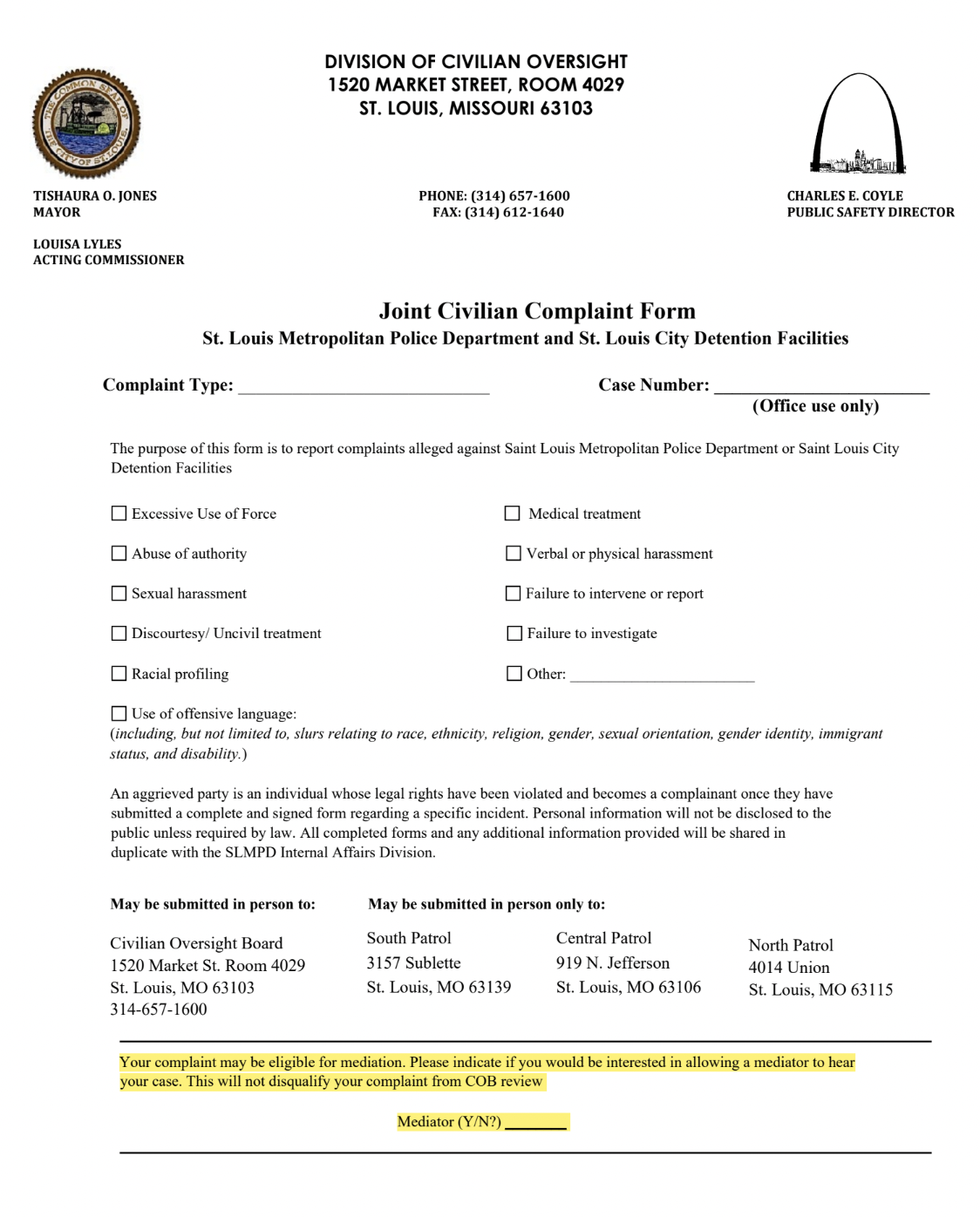 The complaint process begins with the completion of the Joint Civilian Complaint Form (JCCF).